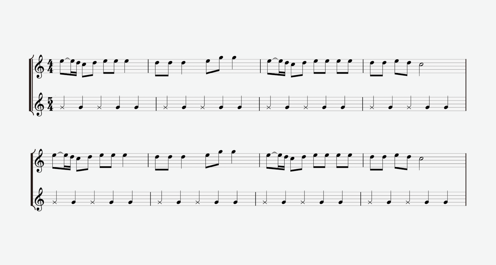 たしかに4/4拍子と5/4拍子が混在して同時に流れています。