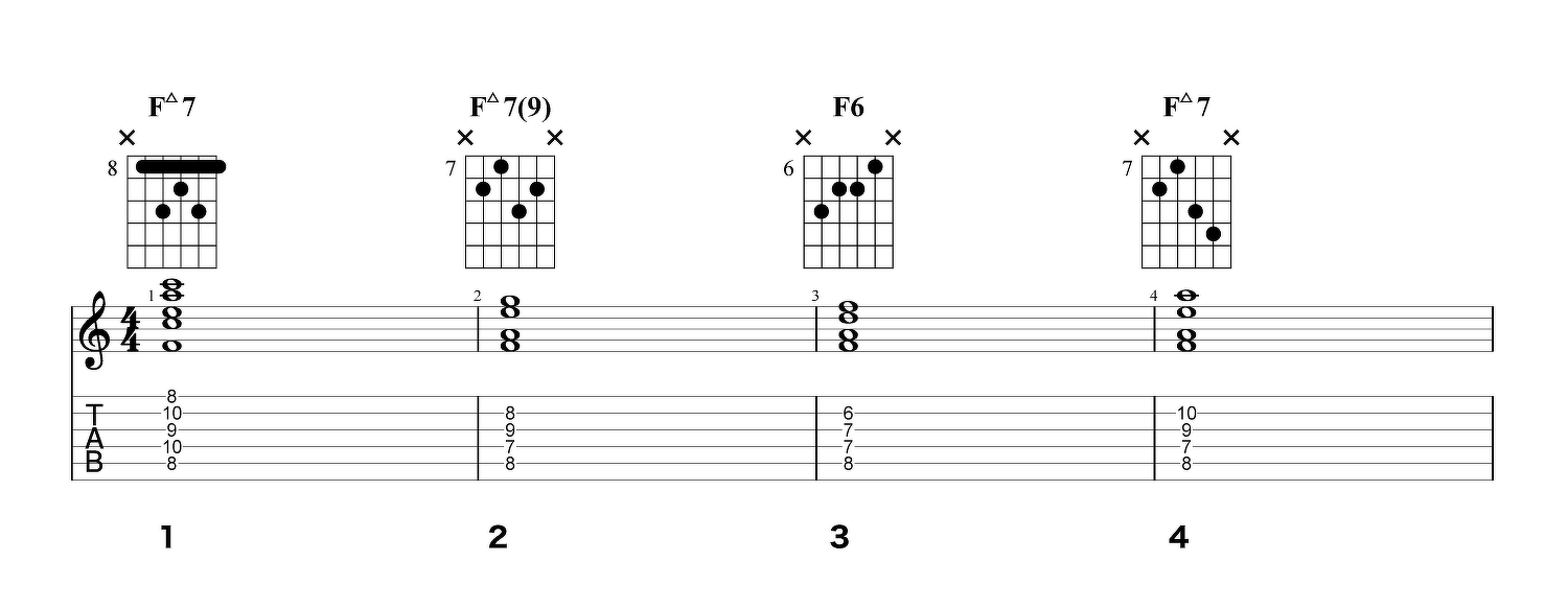 1・3・5・△7 のコードトーンのみで構成されたスタンダードなボイシングです。