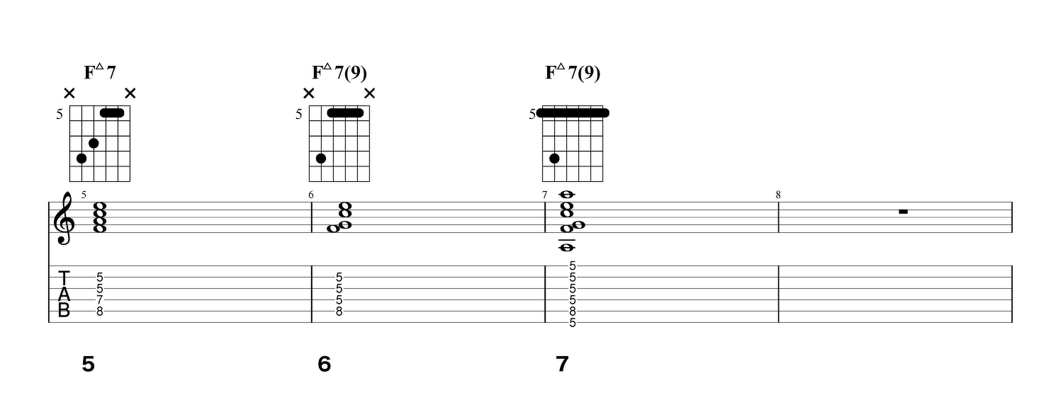 1は『メジャーセブンス5弦ルート』といえばコレ!というノーマルな押さえ方。