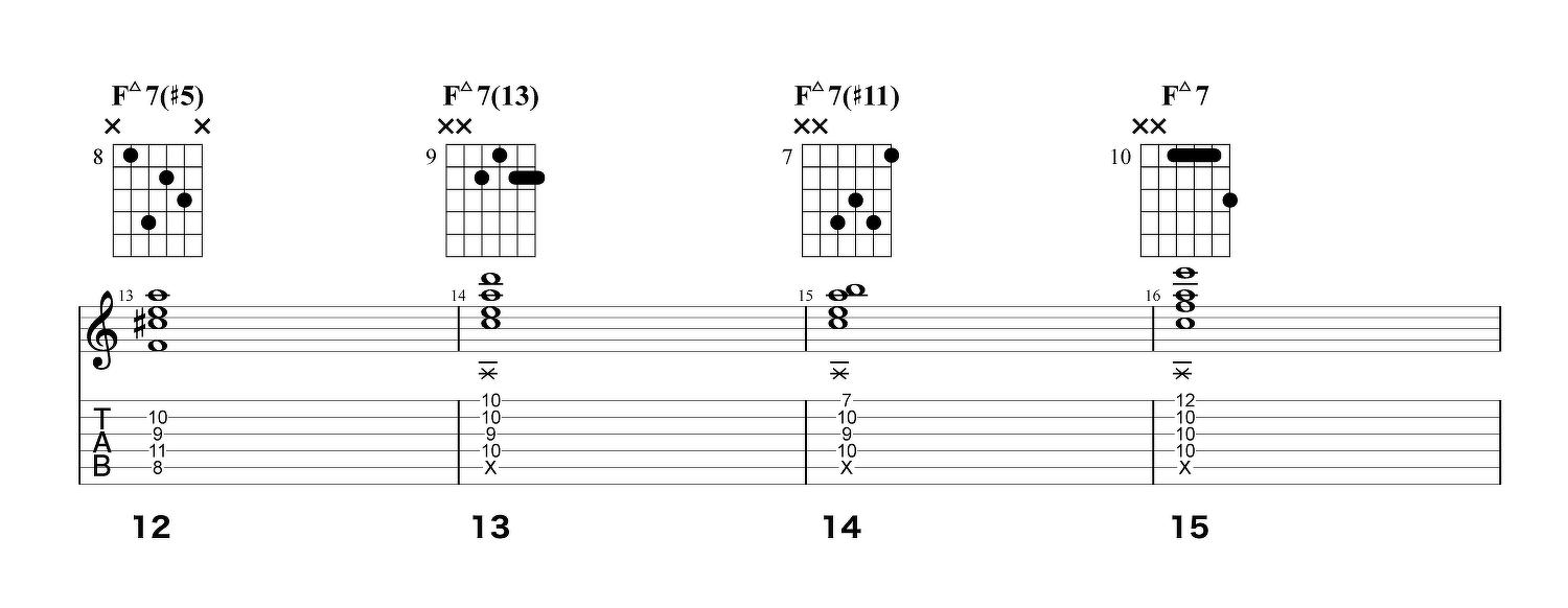 14はルートを省略してトップ(1弦)に#11を入れたもの。