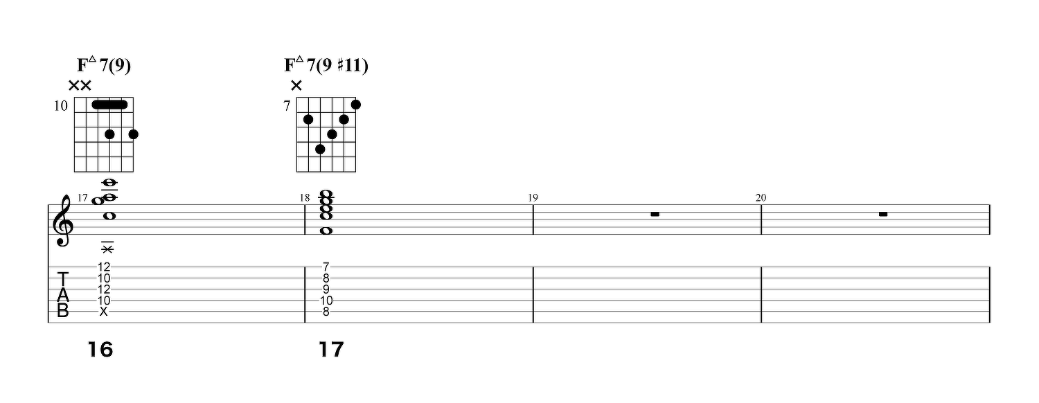 メジャーセブンスに#11が加わるとエグ味が出る、というかかなりクセのある響きになるのですが(=リディアンなサウンド)、とても個性のあるかっこいいサウンドになるのでよく使われますね。