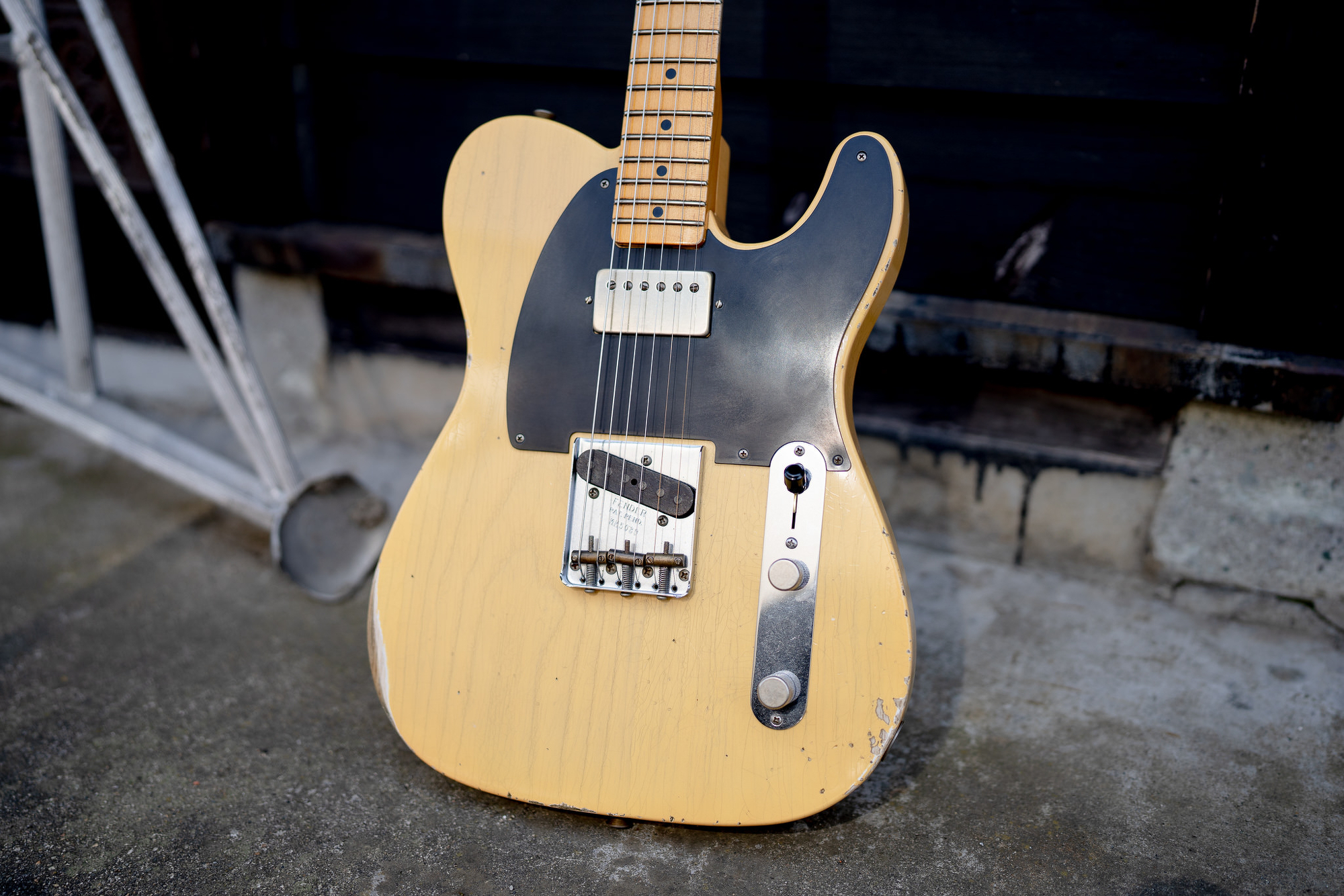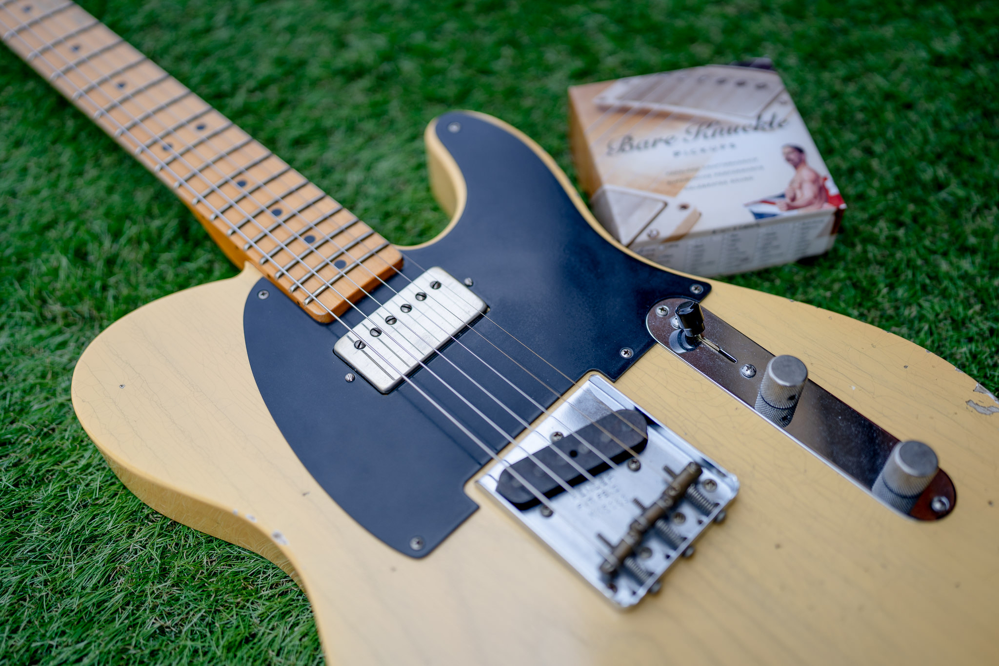 ギターボディーと雰囲気を合わせるために、耐水ペーパーで削ったりして独自のレリック加工を施しました。